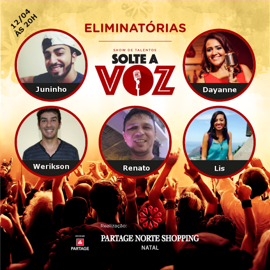 Sucesso de público na primeira eliminatória, o “Solte a Voz” continua sua busca pela grande voz potiguar. Nesta terça-feira (12), mais 5 candidatos sobem ao palco, na Praça de Alimentação do Partage Norte Shopping, para disputar as 2 vagas da semifinal. Nesta edição, os candidatos que concorrem à preferência dos jurados são: Juninho Rocha, Dayanne Nunes, Werikson Brandão, Renato Silva e Lis Oliveira.