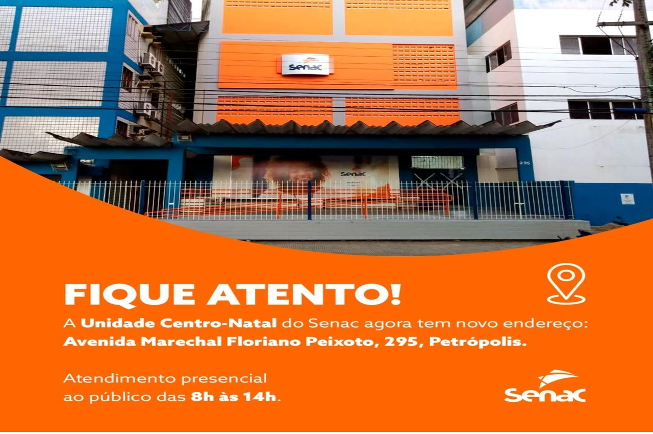 A partir desta segunda-feira (06) o Senac Centro, bem como a Administração Regional da instituição passa a funcionar em novo endereço, localizado na Avenida Marechal Floriano Peixoto, 295, Tirol – Natal-RN.