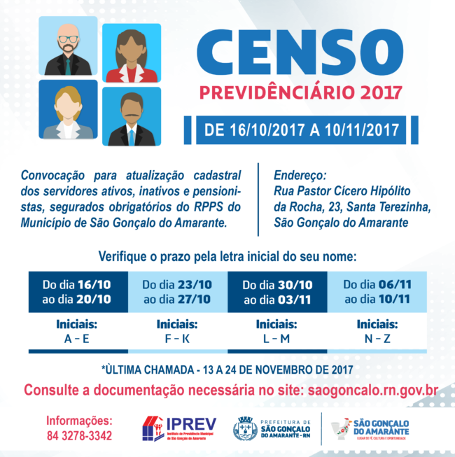O Instituto de Previdência Municipal de São Gonçalo do Amarante (IPREV) realizará, a partir da próxima segunda-feira, dia 16, o Censo Previdenciário 2017. A atualização cadastral, financeira e funcional precisa ser feita, presencialmente, por todos os servidores ativos, inativos e pensionistas da prefeitura, Câmara Municipal e Serviço Autônomo de Água e Esgoto (SAAE).