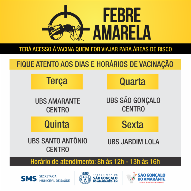 A Prefeitura de São Gonçalo do Amarante, através da Secretaria Municipal de Saúde, informa que também está participando do calendário vacinal contra à febre amarela em 2018.