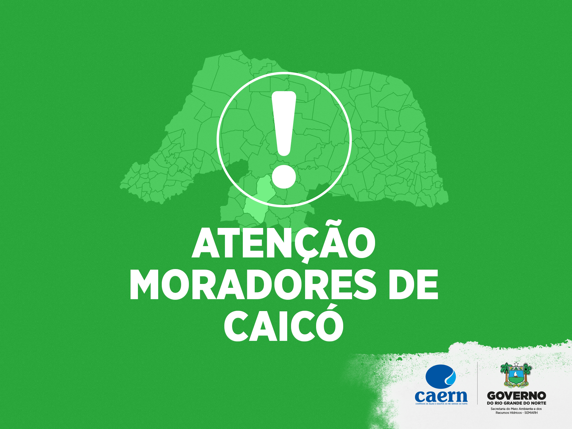 A Companhia de Águas e Esgotos do Rio Grande do Norte (Caern) informa que houve um erro na cobrança da conta de água no bairro Nova Caicó, na cidade de Caicó, referente ao mês de setembro. O sistema inseriu, indevidamente, valor referente ao consumo de água, quando esta está suspensa. Uma nova conta, contendo a cobrança apenas pelo serviço de esgotamento sanitário, será emitida pela Companhia, e entregue pelos leituristas, nos imóveis do referido bairro.