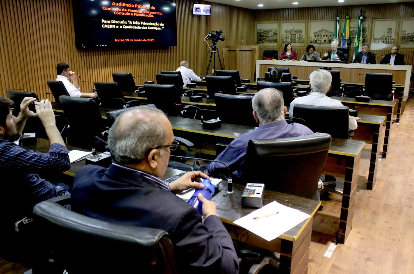 A Comissão de Finanças, Orçamento, Controle e Fiscalização, realizou, na manhã desta segunda-feira (19), audiência pública para debater a não privatização e a qualidade dos serviços da Companhia de Águas e Esgotos – Caern. Proposta pelo vereador Ubaldo Fernandes (PMDB), a audiência contou com a participação de representantes da Agência Reguladora de Serviços de Saneamento Básico do Município de Natal (Arsban), da Secretaria Municipal de Planejamento (Sempla), Caern, Secretaria Municipal de Obras Públicas e Infraestrutura (Semov), além dos vereadores Luiz Almir (PR),presidente da Comissão, Dinarte Torres (PMB) e Klaus Araújo (SD).