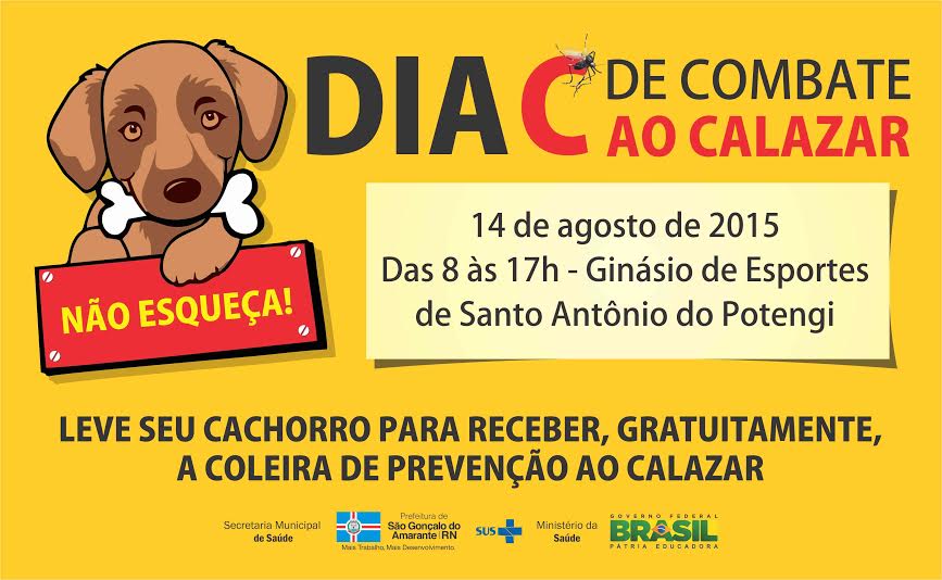 O Dia “C” acontecerá na sexta-feira (14), das 8h às 17h, na praça do Ginásio de Santo Antônio do Potengi. Ainda está programada a distribuição de panfletos educativos, cadastramento de animais e encoleiramento dos cães. O objetivo da ação é conscientizar, sensibilizar e envolver a população para a prevenção ao Calazar no município, além de reduzir e controlar os índices de infestação animal.