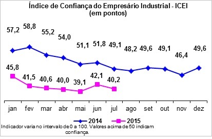 O Índice de Confiança do Empresário Industrial (ICEI) do Rio Grande do Norte retomou a trajetória de queda em julho, declinando de 42,1 para 40,6 pontos, após registrar moderação em junho. A falta de confiança se acentuou em todos os portes empresariais considerados, segmentos de atividade e componentes do ICEI, quais sejam, índices de condições atuais da economia do país, do estado e da empresa, e expectativas correspondentes em relação aos próximos seis meses.